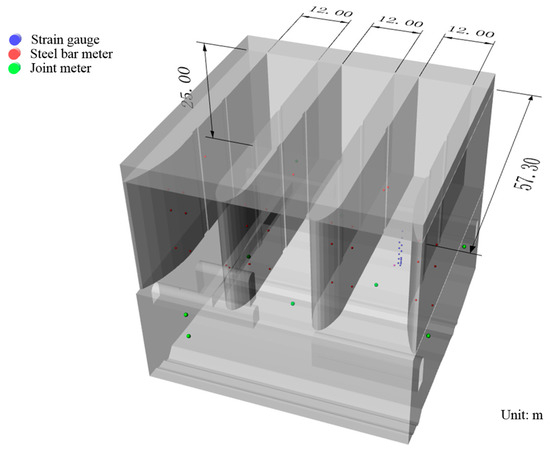 Three sluice openings in the Dajiang scouring sluice were selected for this study. The chamber of the sluice is 57.3 m long, 12.0 m wide, and 25.0 m high. Three types of monitoring recorders, including 21 steel bar meters, 13 strain gauges, and 10 joint meters were used in the dam. Most of them can output temperature except 8 joint meters. However, only 17 steel bar meters and 9 strain gauges can output reliable stress and strain data, respectively. The three types of devices were buried in the dam to be part of the monitoring system permanently. The layout of the monitoring system is shown in Figure 4. The monitoring period was from 1 January 2008 to 30 December 2013. Each set of data was obtained every 5 days. Actually, there were 428 data in each dataset because of some errors in monitoring.