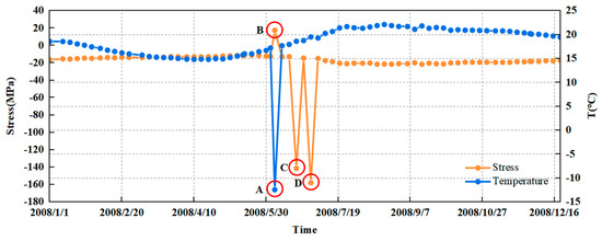 It is obvious that the four points A, B, C, and D are abnormal. In this study, a method based on data continuity was adopted to identify and eliminate these outliers. Specifically, if the value of a data point differs significantly from its neighboring points, it is considered to be a potential anomaly caused by a temporary malfunction. To rectify this, the average of the values of the two neighboring points on either side of the anomalous data point is calculated, and this average value is used to replace the original outlier. This method not only removes abnormal errors but also maintains the coherence and authenticity of the data.