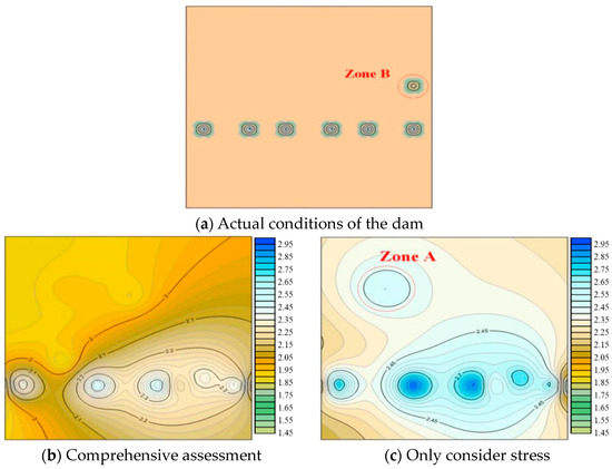 Based on the weights of each indicator obtained from Table 6, we conducted a comprehensive assessment of the selected study area. By weighting the evaluation indicators obtained through the IDW method with their respective weights, we calculated the comprehensive risk assessment values for various parts of the dam. Subsequently, these assessment values were mapped onto a chromatogram to generate contour maps of comprehensive assessment, as shown in Figure 9b. To validate the superiority of our proposed method, we also generated contour maps based on a single stress indicator evaluation for comparison, as shown in Figure 9c.
