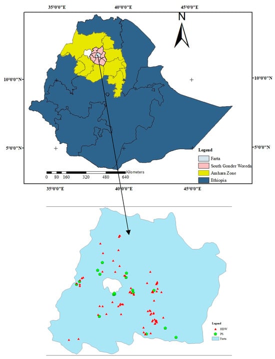 The Farta district, which is found in the Amhara regional state, is located approximately 597 km away from the capital city of Ethiopia, Addis Ababa. It is situated in the northwest highlands of Ethiopia between the coordinates 11°40′ and 12°2′ North and 37°50′ and 38°18′ East as shown on Figure 1. The total land area of Farta district is 805.76 km2, and it is divided into 32 administrative units or wards, which are known in Ethiopia as Kebeles. The district receives an annual rainfall between 1097 and 1954 mm, with a long-term average of 1248 mm [15]. The mean maximum temperature is 21 °C, encountered from February to May, and the minimum temperature is 9.6 °C, from June to January, whereas the average annual temperature is 15.5 °C. The central statistics agency projected that the population of Farta Woreda would reach 234,143 in 2022, with the majority (80%) living in rural areas [16].