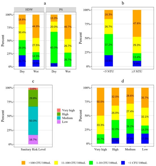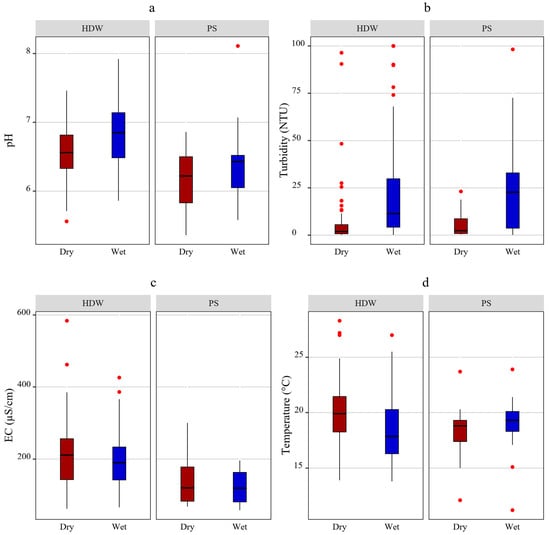During the dry season, the median turbidity was 2 (ranging from 0 to 96.4 NTU), while in the wet season, it was 182.6 (ranging from 0.1 to 100 NTU). In the dry season, approximately 29.3% of samples had turbidity levels that exceeded the maximum recommended level of 5 NTU. However, during the wet season, this percentage increased significantly to 71.7%. Overall, 50.5% of samples did not conform to the national standard for turbidity. A significant difference in turbidity was observed between the wet and dry seasons, as indicated by the Mann–Whitney U test (p < 0.05). This is shown in Figure 2b, where the box plot for the dry season is positioned lower than that of the wet season, indicating higher turbidity levels during the wet season. HDWs and PSs exhibited median turbidity values of 4.9 NTU and 6.8 NTU, respectively. The percentage of samples that did not conform to the turbidity standard was 50% for HDWs and 52.9% for the PSs. The Mann–Whitney U test indicated no significant differences in turbidity between HDWs and PSs.
