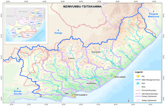 The WMA7 is situated mainly in the province of the Eastern Cape and some parts of the study area fall into the KwaZulu Natal, Western Cape Province and Northern Cape Province [14]. Further, the WMA7 is comprised of several catchments: Mzimvubu, Sundays, Great Kei, Keiskamma, Great Fish, Tsitsikamma, Swartkops, Bushmans, Algoa and Gamtoos. However, for the purpose of the current study, the following major drainage regions were considered: the Sundays, Great Fish, Great Kei, Gamtoos and Mbashe; the smaller drainage regions were not considered due to lack of data. The study area consists of over 300 quaternary catchments, covering a total catchment area of more than 124,730 km2 [14]. The study area’s topography is hilly to mountainous with plains and hills of the Groot Karoo, with the Drakensberg Mountains along the northeastern boundary of the study area. Further, the rivers are deeply incised in the coastal strip [14]. Figure 1 shows a locality map of the study area.