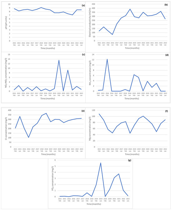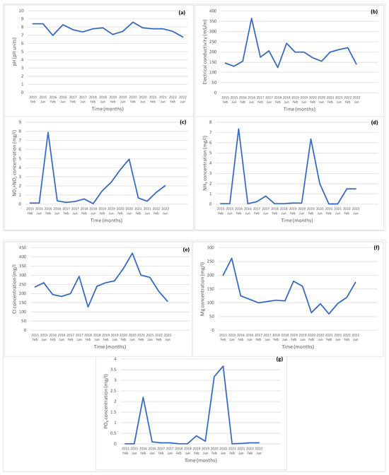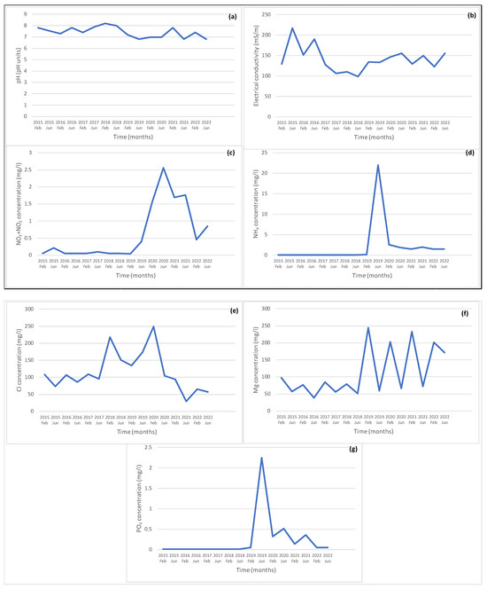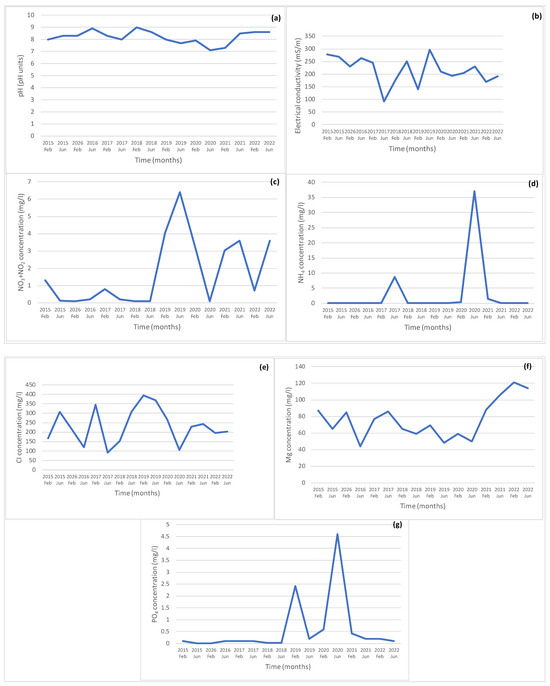 Trends analysis of pH (a), EC (b), NO3 + NO2 (c), NH4 (d), CI (e), Mg (f) and PO4 (g) in the Gamtoos catchment.