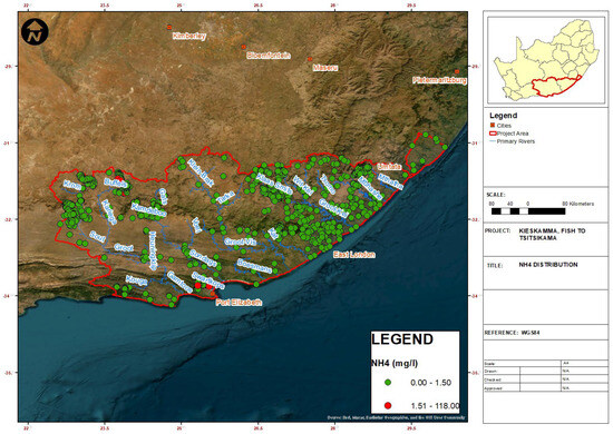 Water quality assessment in the Great Kei catchment showed nutrient enrichment. The NO3 + NO2 values ranged from 0.005 mg/L to 4.7 mg/L with a mean value of 1.6 mg/L (Table 7). The maximum value of PO4 was 3.4 mg/L and the mean value of 0.8 mg/L. The mean values of these two nutrients exceeded their respective target water quality range. The presence of nutrients in the water systems could pose a problem for aquatic life, and recreational and domestic uses because of eutrophication. The South African Guideline for NO3 + NO2 in aquatic ecosystems is 1 mg/L, while aquatic ecosystems’ target range for PO4 is 0.025 mg/L. The values of EC and CI were recorded at maximum values of 256 mg/L and 390 mg/L, respectively. There was a steep rise of NH4-N, with a maximum value of 13.4 mg/L and a mean value of 2.8 mg/L. The high presence of NH4 and NO3 + NO2 could be an indication of agricultural contaminants in the study area. The WHO safe limit for NO3 for a lifetime is 10 mg/L as N [27]. The results of these parameters concurred with earlier findings by DWS [14] which identified NO3, NH4 and turbidity from agricultural activities as the main sources of pollution in the study area. pH of the catchment showed neutrality with 7.8, while Mg recorded a maximum value of 132 mg/L, which was beyond the target water quality range.