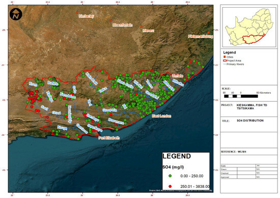 In conclusion, areas in the central (Great Fish catchment) and western parts (Gamtoos catchment) of the WMA7 reflected marginal to poor groundwater quality. The NO3 + NO2 value level was marginally high (2.12 mg/L) compared to the required limit of 1.00 mg/L. According to a study by DWS [33], EC spatial distribution in the catchment generally reflected lithological controls, favourable recharge and rainfall conditions. The study by DWS [33] noted that though some parts of the catchments in the WMA7 had poor groundwater quality, it was not always impacted by anthropogenic sources but happened naturally in aquifers, owing to interaction with rock and sediments. However, spatial distributions and quality results of NH4-N, SO4 and NO3 + NO2 proved to be generally evident that pollution sources were man-made. Therefore, groundwater treatment is recommended to render it suitable for sensitive water users.