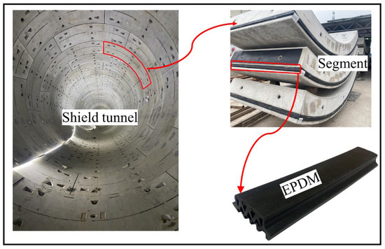 With the acceleration of urbanization and the advancement of mechanized construction, shield tunneling has been widely applied in the construction of urban transportation networks due to its advantages of efficiency, safety, and suitability for various geological conditions [1]. In China, most urban subways are built in strata below the groundwater level. During the construction and operation stages of shield tunnels, leakage of water remains a persistent issue. Currently, the method to prevent leakage at the joints of shield tunnel segments involves filling the segment grooves with elastic rubber seal gaskets, such as Ethylene Propylene Diene Monomer (EPDM) [2]. EPDM, known for its excellent oxidation resistance, corrosion resistance, low cost, and stable performance, has been widely utilized in engineering applications [3].