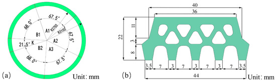 The shield tunnel lining for Zhengzhou Metro Line 5 has a cross-section with specific measurements. The inner diameter of the lining is 5500 mm, the outer diameter is 6200 mm, and the thickness is 350 mm. To ensure a tight seal between the tunnel segments, ethylene propylene diene monomer (EPDM) elastic rubber seals are used, as illustrated in Figure 2. Figure 3a provides a visual representation of the cross-section diagram of the shield tunnel, while Figure 3b displays the precise dimensions of the sealing gasket.