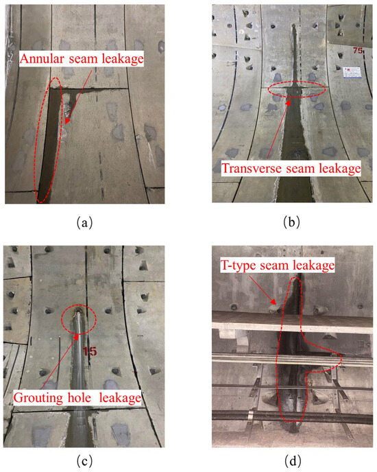 Map of leakage water locations: (a) Annular seam leakage; (b) Transverse seam leakage; (c) Grouting hole leakage; (d) T-type seam leakage.