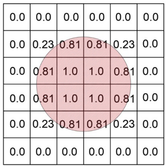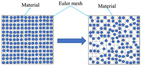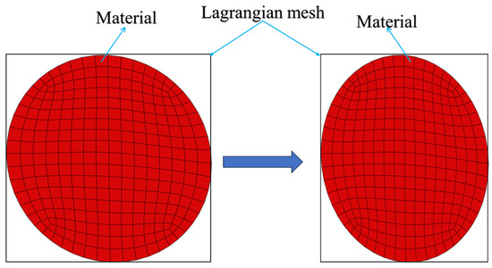 In ABAQUS, Eulerian materials interact with Lagrangian elements through Euler-Lagrangian contact, and this type of contact analysis is commonly referred to as Coupled Eulerian-Lagrangian analysis [26]. This method has significant advantages in handling large deformations of solid materials and supporting adaptive mesh refinement. Generally, in the Lagrangian mesh, the displacement of deformable bodies is a function of material coordinates and time, where nodes are closely connected to the material and elements deform correspondingly with the material. A notable feature of the Lagrangian mesh is that it is always filled 100% with a single material, ensuring consistency between the material boundary and the element boundary, as shown in Figure 6. In contrast, in the Eulerian mesh, the displacement of deformable bodies is a function of spatial coordinates and time. The finite element nodes are spatial nodes, fixed in space, and the material flows through these undeformed elements [27]. Since Eulerian elements may not be completely filled with material, many elements can be partially or completely empty, thus the material boundary is redefined at each time increment step, as illustrated in Figure 7.