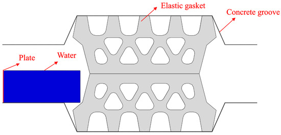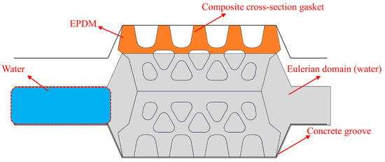 The fluid–solid coupling model at the joints of shield tunnel segments constructed through Eulerian-Lagrangian analysis method mainly includes elastic rubber sealing gaskets, concrete grooves, water, and the plates driving the flow of water, as shown in Figure 9.