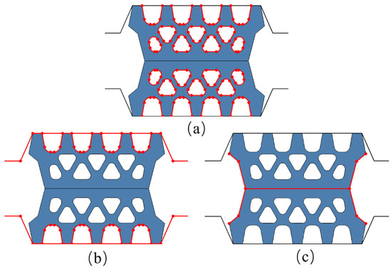 After assembling the model, it is necessary to set the contact types between the Eulerian and Lagrangian bodies. In order to achieve the coupling between solids and fluids, the contact type between the Eulerian and Lagrangian bodies is set to a general contact based on the “penalty” contact method [32]. Considering that the elastic sealing gasket has multiple holes and various cross-sectional shapes, it is crucial to reasonably set the contact relationship between the gasket itself and between the gasket and the concrete grooves. During the simulation, self-contact is applied to the outer surface of the gasket and between internal holes, as shown in Figure 11a. The contact attributes for the normal direction are set to hard contact, while the tangential direction is set to penalty mode, with a contact friction coefficient of 0.3. Surface contact is employed between the gasket and between the gasket and the concrete grooves, as shown in Figure 11b,c, with a contact friction coefficient set to 0.5.