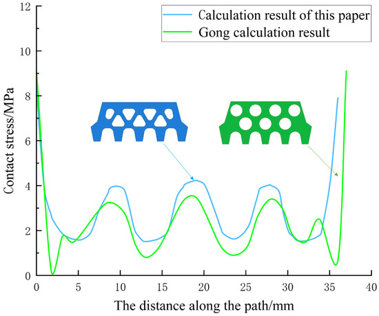 To ensure the accuracy of the subsequent computational analysis, it is necessary to verify the effectiveness of the gasket model constructed in this paper. Previously, Gong et al. [33] used the ABAQUS software to analyze the contact stress of an elastic rubber gasket under compression and obtained the contact stress when the gasket opening is 0 mm. In order to verify the correctness and reliability of the model presented in this paper, the contact stress of this model under the same conditions (i.e., when the opening amount was 0 mm) was compared with the research results of GONG et al. See Figure 12 for the comparison results.