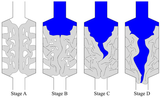 Stage C: Water wedge insertion stage. Under the external water pressure, water wedges into the sealing gasket, and the flow path between the sealing gaskets gradually develops. At this point, half of the interface between the sealing gaskets separates, and the pressurized water continues to squeeze the remaining gaps in the sealing gasket. The squeezed elastic sealing gasket moves to both sides and tends to deform downward.
