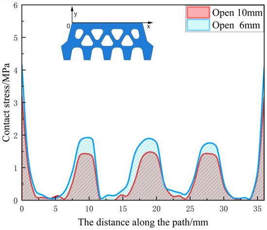 The permeation stress barrier, which is formed by the initial contact stress, defines the envelope [34]. In the simulation process, pressurized water must overcome this barrier along its flow path in order to permeate. Therefore, the permeation stress barrier plays a crucial role in determining the waterproof performance of the gasket at the joint of the pipe segments. As shown in Figure 15, the distribution of initial contact stress between the sealing gaskets exhibits a “W” symmetrical distribution when the gap opening is 6 mm and 10 mm. This means that the contact stress is higher at the ends and lower in the middle. This phenomenon occurs because there is stress concentration at the ends of the sealing gasket. Furthermore, as the gap opening decreases, the peak contact stress in the middle of the contact surface of the elastic rubber sealing gasket gradually increases. The magnitude of this contact stress is crucial for the waterproof performance of the sealing gasket. Therefore, decreasing the gap opening effectively enhances the waterproof performance of the sealing gasket.