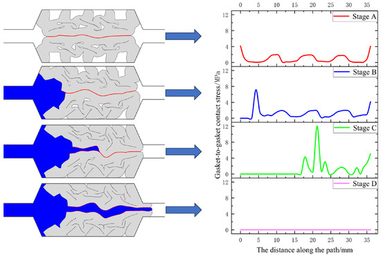 As shown in Figure 14, the average contact stress of the sealing gasket can be observed at different stages. When the gap opening reaches 6 mm after completing the compression, due to the pressurized water extrusion and water wedge insertion, the average contact stress between the sealing gaskets shows a continuous increasing trend. During the pressurized water extrusion stage, the average contact stress between the sealing gaskets increases by approximately 58.1%. When the water starts to wedge in, the average contact stress between the sealing gaskets begins to decline until it reaches 0 after the water breakthrough.