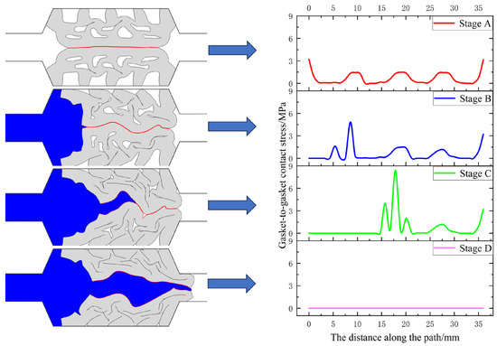The contact stress between the sealing gaskets at different stages of leakage is demonstrated in Figure 16 and Figure 17. Stage A corresponds to the completion of gasket compression, while Stages B, C, and D represent the pressurized water extrusion, water wedge insertion, and final leakage stages, respectively. To determine the failure of the waterproof system in the shield tunnel segment gasket under water pressure, the criterion is the absence of contact stress between the sealing gaskets. If the contact stress exceeds zero, the waterproof system is deemed effective. Conversely, if the contact stress equals zero, the waterproof system is considered to have failed.