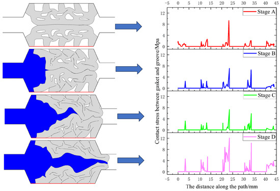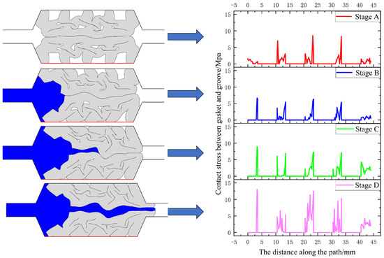 The contact stress between the sealing gasket and the concrete groove during different stages of leakage is shown in Figure 18 and Figure 19. Stage A represents when the gasket compression is completed, while Stages B, C, and D represent the pressurized water extrusion, water wedge insertion, and final leakage stages, respectively. From the figures, it is evident that the contact stress between the sealing gasket and the concrete groove fluctuates intermittently throughout the entire water seepage process. This fluctuation is primarily caused by the irregular compression of unclosed holes on the interface between the sealing gasket and the concrete groove. As the pressurized water enters, influenced by the external water pressure, the peak contact stress gradually increases between the sealing gasket and the concrete groove. When the pressurized water eventually penetrates the sealing gasket, the contact stress between the sealing gasket and the concrete groove reaches its maximum value. Analyzing the distribution of contact stress between the sealing gasket and the concrete groove within the range of 0–5 mm, it is noticeable that the contact stress shifts from gasket compression to external water squeezing and leakage periods. Some contact stresses become zero, indicating that certain parts of the sealing gasket lose contact with the concrete groove.