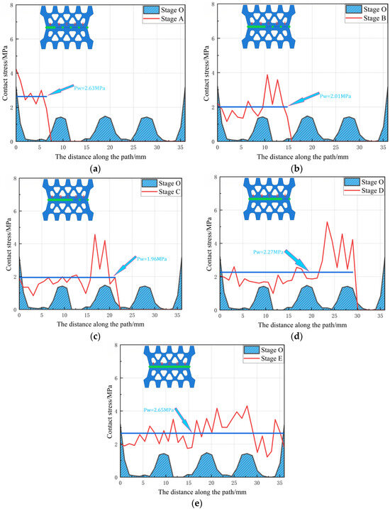 In order to investigate the entire waterproof failure process of the elastic sealing gasket, a comprehensive simulation was conducted under the influence of water pressure, revealing the evolution of water pressure throughout the seepage process, as shown in Figure 21. Stage 0 represents the initial contact stress formed after the compression of the elastic sealing gasket, indicating the absence of seepage at this stage. Upon exposure to water pressure, the water pressure initially acts on the left side of the elastic sealing gasket. As the water pressure increases, the water breaches the first part of the interface between the sealing gaskets, leading to the separation of the first part of the sealing gasket, with the waterproof threshold of Part A being 2.63 MPa. Subsequently, sections B, C, D, and E are gradually breached by water, with corresponding waterproof thresholds of 2.01 MPa, 1.96 MPa, 2.27 MPa, and 2.65 MPa, respectively. When the waterproof threshold reaches 2.65 MPa, the contact surface of the elastic sealing gasket is completely penetrated, allowing pressurized water to enter the interior cavity of the shield tunnel segment, thus resulting in the failure of the waterproof system. By analyzing the waterproof thresholds of different sections, a better understanding of the impact of the permeation stress barrier on the waterproof performance of the sealing gasket can be obtained.