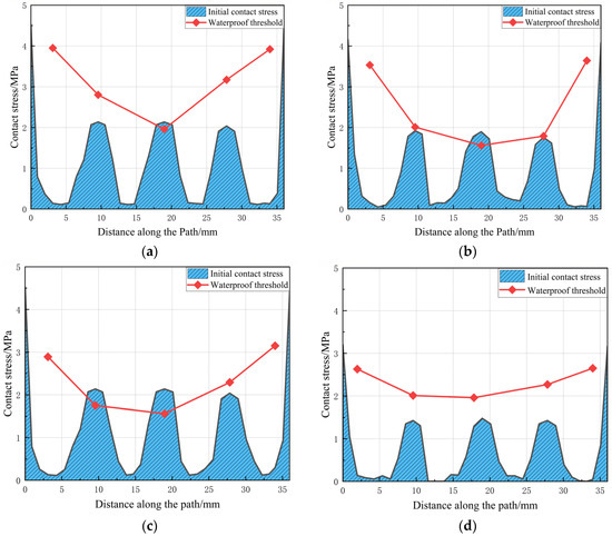 Waterproof threshold diagram of gasket under different opening amount: (a) Open 4 mm; (b) Open 6 mm; (c) Open 8 mm; (d) Open 10 mm.