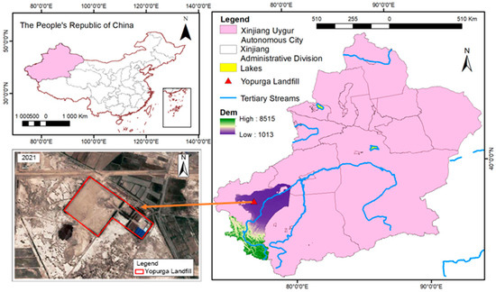 The Yopurga landfill is situated in Yopurga County within the Kashgar region of Xinjiang, delimited between longitudes 76°25′ to 77°25′ E and latitudes 38°46′ to 39°22′ N, As shown in Figure 1. This area lies at the eastern end of the Kashgar Plain and the western edge of the Taklamakan Desert, near the lower reaches of the Gez River. The topography of this region is characterized by slightly higher elevations around the perimeter with a flatter central area, greater north–south relief, minor slope gradients, and more significant east–west slope gradients. The landfill covers an area of 40,000 square meters, including a 4000 square meter management area.