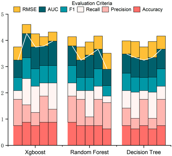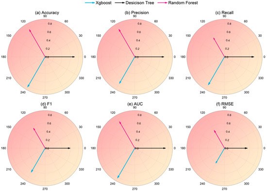 Under the best hyperparameter settings, Decision Trees, Random Forest, and Xgboost models were validated using five-fold cross-validation. The models’ performances were compared across six evaluation metrics: Accuracy, Precision, Recall, F1, AUC, and RMSE, as illustrated in Figure 2. To mitigate the influence of overfitting and other phenomena on the validation results, the average of five runs was taken as the final outcome for each metric. For Accuracy, Precision, Recall, and F1, values closer to 1 indicate better performance, while for RMSE, values closer to 0 are preferable. The use of multiple validation metrics ensures the reliability of the Xgboost algorithm’s ranking of water quality indicator importance, significantly reducing the subjectivity and uncertainty of water quality evaluation results. The Xgboost algorithm’s low RMSE and high Accuracy, Precision, Recall, and F1 scores demonstrate its superiority over other algorithms. Due to its excellent performance and adaptability to the dataset, the Xgboost model is considered the preferred tool for determining key indicator weights in water quality assessment, as also supported by research from Dao Nguyen Khoi et al. and Md Galal Uddin et al. [16,43].