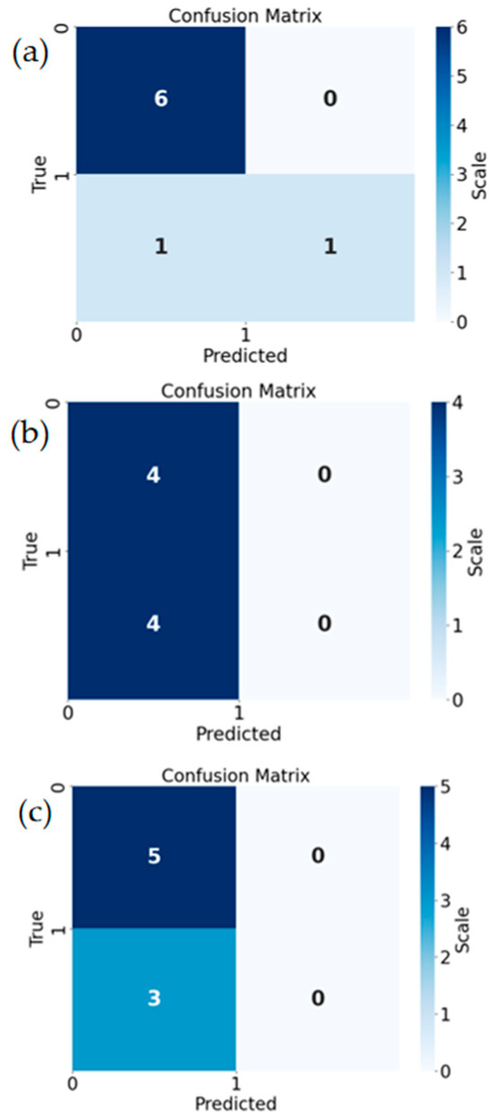 As shown in Figure 4, the Random Forest model has a high true positive rate but one false negative. Xgboost model performs perfectly within this dataset, with no misclassifications. The Decision Tree model also performs well, correctly identifying most positive and negative cases without any misclassifications. From the confusion matrices, it can be observed that the Xgboost model provides the best performance for this dataset, with no false positives or false negatives. Both the Random Forest and Decision Tree models perform well but have minor misclassifications compared to the Xgboost model. However, due to the limited data used for training and prediction, there may be a risk of overfitting, leading to some degree of uncertainty.