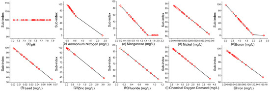 To provide a standardized framework for the importance measure in the WQI calculation, each indicator’s measured value was converted into a dimensionless score ranging from 0 to 100 through SI functions [16,17], where 0 represents the lowest level, and 100 represents the optimal level. Following Uddin’s method, this study calculated the SI for each water quality indicator [11]. The standard values for all water quality indicators were based on the national groundwater quality standards. The specific formulas for each indicator are shown in Table 2. The SI calculations are given by