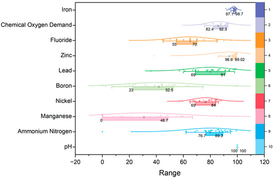 Analysis in Figure 6 shows significant heterogeneity in the function values of different water quality indicators. Normal distribution is a fundamental assumption for data symmetry and central tendency, and many statistical tests are predicated on this basis. From the perspective of individual indicators, Mn and B exhibited the widest range of variation, with function values ranging from 0 to 48.7 and 23 to 52.5, respectively. Mn displayed a certain degree of skewness with several outliers, indicating its distribution was not normal, while the variability in SI function values for pH and Fe was comparatively lower. Specifically, pH values consistently scored full marks across all sub-indices, indicating uniformity and excellent performance throughout the dataset. Meanwhile, the SI function values for Fe content fluctuated within a narrower range of 97.1 to 98.7, reflecting its stability. These observations reveal that the quality indicators for Mn and B generally performed poorly across the sampled locations, significantly below satisfactory quality thresholds.