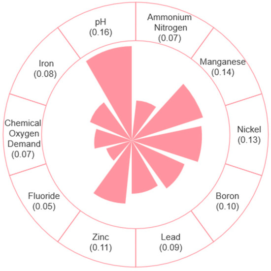 The validated Xgboost algorithm was applied in this study to quantitatively rank water quality classification indicators according to their importance. As illustrated in Figure 7, the results reveal that pH, Mn, and Ni have relative importance weights of 0.16, 0.14, and 0.13, respectively, indicating their significant impact on the model’s predictive performance. In contrast, F-, NH3-N, and COD have lower importance weights of 0.05, 0.07, and 0.07, respectively. This weight allocation method based on the Xgboost algorithm significantly reduces the model’s prediction uncertainty compared to traditional models that rely on expert judgment. Xgboost assigns weights to the ten water quality indicators by constructing decision trees and evaluating the importance of features. Within the studied groundwater area, pH, Mn, and Ni were identified as particularly critical indicators for water quality classification predictions due to their high weights.
