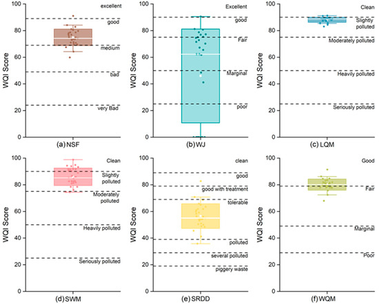 WQI results for different WQI models based on different points: solid lines represent different levels of water quality.