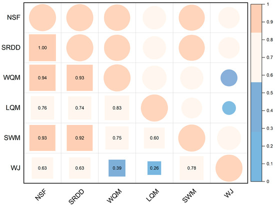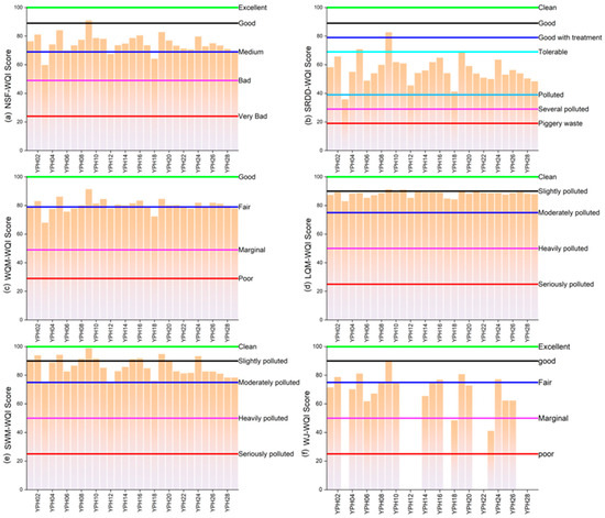 In Figure 9a, the NSF-WQI results showed the following: Class I water samples constituted 1, Class II samples 25, and Class III samples 3, accounting for 3.45%, 86.21%, and 10.35% of the total samples, respectively. In Figure 9b, the SRDD-WQI results indicated the following: no Class I samples, 1 Class II sample, 1 Class III sample, 26 Class IV samples, and 1 Class V sample, representing 0.00%, 3.45%, 3.45%, 89.65%, and 3.45% of the total samples, respectively. In Figure 9c, the WQM-WQI results revealed the following: 16 Class I samples and 13 Class II samples, making up 55.17% and 44.83% of the total, respectively. In Figure 9d, the LQM-WQI results showed the following: 2 Class I samples and 27 Class II samples, accounting for 6.90% and 93.10% of the total, respectively. In Figure 9e, the SWM-WQI results indicated the following: 9 Class I samples and 20 Class II samples, comprising 31.03% and 68.97% of the total, respectively. In Figure 9f, the WJ-WQI results showed the following: no Class I samples, 6 Class II samples, 11 Class III samples, 2 Class IV samples, and 10 Class V samples, accounting for 0.00%, 20.69%, 37.93%, 6.90%, and 34.48% of the total, respectively. It can be seen from Figure 8 that WQI results calculated using the WJ model at multiple monitoring points scored zero, indicating extremely poor water quality at these points under this model. However, in the other five models, most monitoring points scored above the passing line, showing relatively satisfactory water quality. The WQM, SWM, and LQM models especially displayed relatively good water quality performance at most monitoring points. Within the WQI series, WQM and SWM evaluated the water quality of the Yopurga landfill as relatively good, with WJ being the poorest. Overall, excluding WJ, the WQI results suggest nearly all monitoring points’ water quality exceeds Class IV standards, implying overall water quality ranges from average to good. Different WQI models may significantly vary in sensitivity to input data, with the WJ model showing zero scores at multiple points due to its susceptibility to the concentration of disqualifying indicators. Significant differences between models also reflect variations in evaluation standards and actual water quality conditions at each monitoring point. Further analysis of the correlation among various WQI models will follow.