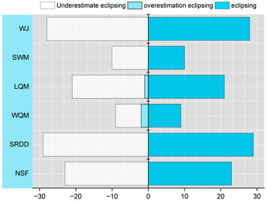 Figure 11 shows the eclipsing distribution when assessing water quality using different WQI models. Eclipsing is categorized as overestimation or underestimation, representing the model’s deviation from actual conditions [16,48]. Results suggest that underestimation eclipsing issues (where assessed water quality is worse than the actual condition) appear more common across all models. The LQM and WQM models displayed relatively fewer overestimation eclipsing errors, with only 1 and 2 occurrences among 21 and 9 misjudgments, respectively. The WQM model had an overestimation eclipsing rate of 6.9% and an underestimation eclipsing rate of 24%, while the SWM model showed a 0% overestimation eclipsing rate and a 34% underestimation rate.