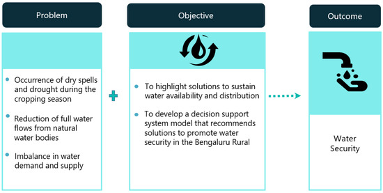 Another study conducted in 2015 [7] on the total available water in Bengaluru rural district, in collaboration with the Central Ground Water Board (CGWB), estimated the total available water from groundwater and surface water sources to be 0.3026 billion cubic meters (BCM). Available groundwater was estimated to be 0.1939 BCM, which accounted for 64.1% of the total available water, and surface water was estimated to be 0.1087 BCM, which accounted for 35.9% of the total available water. However, the total available water of 0.3026 BCM was less than the total water demand of 0.54717 BCM, resulting in a water shortage of 0.244 BCM, which was fulfilled mainly by the transport of water over long distances. The projected total water demand and available water during the year 2020 were estimated to be 0.6381 and 0.3026, respectively, resulting in a water shortage of 0.33548 BCM [7]. This lack of parity between the availability and demand points to the need to save and harvest water to decrease the demand on the one hand, and increase the availability on the other hand. This principle forms the basic premise of the decision support system for water security (DSS-WS) proposed in this paper.