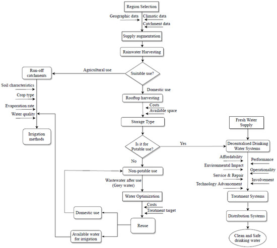 In this context, this paper aims at illustrating the concept of a decision support system (DSS) tool that, following the Whole-of-Resource approach (WORA), facilitates the selection of the optimum water treatment and distribution systems from the available ones based on the user’s scoring of the different selected criteria. The illustrative proof of concept DSS also provides recommendations on the optimal rainwater harvesting system and water-saving agricultural practices based on the agro-ecological parameters input by the user. This paper does not present a definitive tool that is ready to be used, but rather provides a primer that can be further developed to be made ready to use in different contexts.