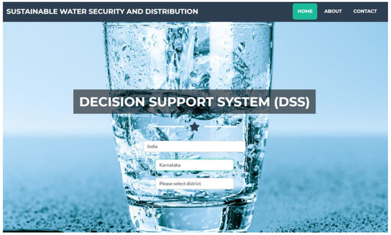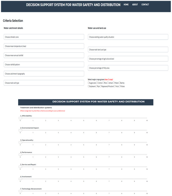This first working version of the DSS framework is aimed to be an initial illustrative proof of concept as a primer for the detailed context-specific development of a decision support system to be used by local administrators or engineers associated with the drinking water supply departments. Based on a set of region-specific inputs provided by the user, the DSS provides a set of recommendations covering the aspects of water conservation, water treatment, and water distribution. The inputs to be provided by the user appear as shown in the following figures, which give an overview of how the navigation in the DSS model works. While the seven criteria (a–g in Table 2 and Table 3) are expected to be constant across different contexts, the further development of the DSS and its validation in specific contexts shall take into consideration local needs and requirements, and the different available options for the treatment and distribution options shall be adapted accordingly.