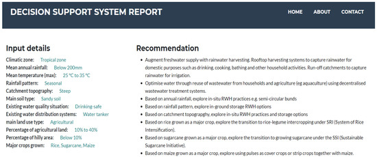 The top part of the DSS illustration above (Figure 7) focuses on the inputs needed for decision support recommendations for improving water availability through savings in agriculture, rainwater harvesting, and groundwater recharge. The inputs in the bottom part of the DSS illustration (Figure 7) are the scores given by the user to the different criteria based on which decision support recommendations for the drinking water treatment and distribution system are provided. These two parts of the DSS illustrated above are integrated into a comprehensive DSS recommendation, which looks like that which is shown in Figure 8, Figure 9 and Figure 10.