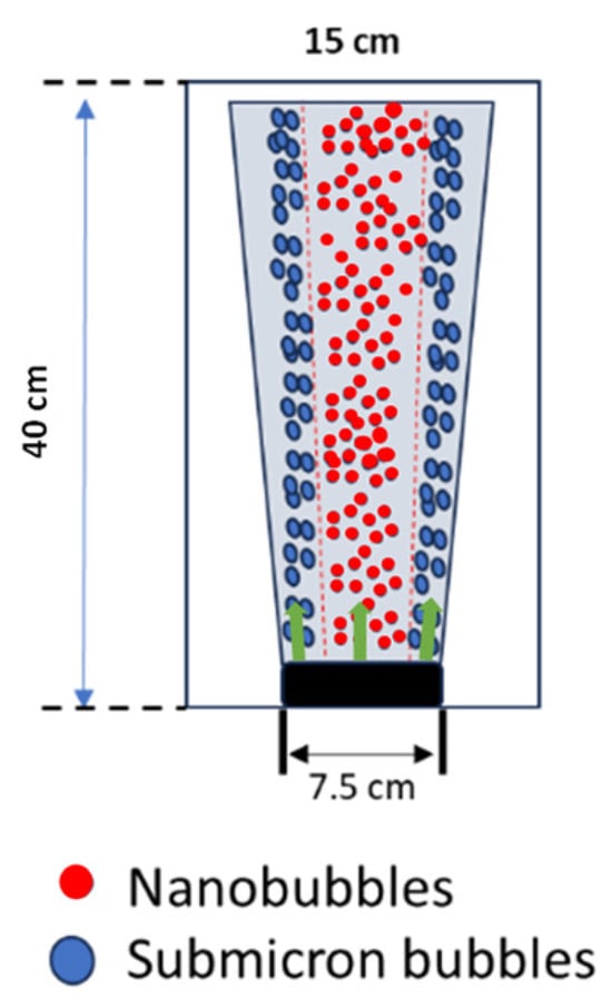 Given a diffuser width bw = 7.5 cm and empirical values of the densimetric bubble Froude number measured at the diffuser (F0), Equation (4) provides the initial velocity w0 for integral models. In this study, based on the scaling relations (D and F), regions in the plume were considered the “adjustment zone”, i.e., characterized by a constant F [25], which means bubble plumes in stratified bodies of water with different size distributions within the regions (Figure 5). The zeta potential observation also showed that the obtained ultrafine bubbles were stable within the bubble plume region, as shown in Figure 5. Thus, to avoid the stratification of the bubble plume, the ultrafine bubbles were continuously applied during the treatment of dyes to provide unstratified bodies of water.