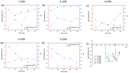 Figure 6 shows the zeta potentials of the water-containing bubbles (WCBs) generated by the disc diffuser at various air flow rates of 1, 2, 3, 4, and 5 LPM and compares their average bubble size. At flow rates of 1, 2, and 3 LPM, the zeta potential of generated bubbles was very unstable as time elapsed (Figure 6a–c). In contrast, the zeta potentials obtained at 4 and 5 LPM were relatively stable (Figure 6d,e). The lowest zeta potential was obtained for 5 LPM; however, the average size of the bubbles was larger compared to 3 LPM as time elapsed. Thus, a small size distribution and stable WCBs were generated by the disc diffuser at an air flow rate of 3 LPM (Figure 4f). The pH of the WCBs at 1 and 2 LPM tended to increased, while, for 3, 4, and 5 LPM, it tended to decrease.