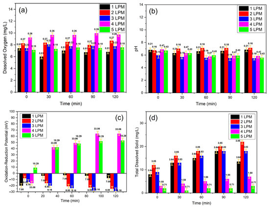 The physiochemical characteristics of oxidative WCBs generated by the disc diffuser at various air flow rates: (a) DO, (b) pH, (c) ORP, and (d) TDS.