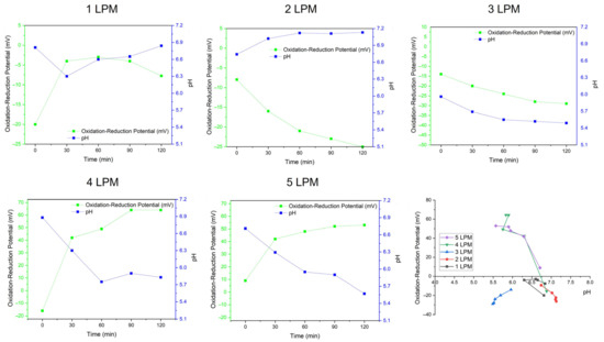 The physiochemical characteristics of oxidative WCBs generated by the disc diffuser at various air flows: ORP, pH, and Time.