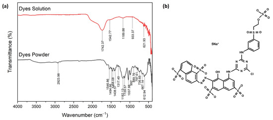 Figure 9 shows the FTIR spectroscopy of the corresponding molecular structure of red dye Navacron Ruby S-3B in solution and powder [39]. The result showed the presence of thiocyanate, acknowledged as a toxic chemical, in the solution [40,41]. The detailed chemical composition of red dye Navacron Ruby S-3B in the form of solution and powder is shown in Table S3. The elemental analysis of XRF clearly showed the presence of Na, S, and Cl elements (Table S4), in agreement with their chemical structure, as shown in Figure 9b.