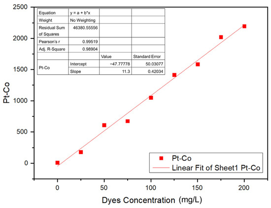 A calibration curve was prepared for the Navacron Ruby S-3B at various concentrations to obtain the corresponding color scale (Pt-Co), as shown in Figure 12. The residual sum of squares of the curve was 98.9%, and the accepted mathematical model was applied in the estimation of the color scale (Pt-Co) of the solution under investigation [44].