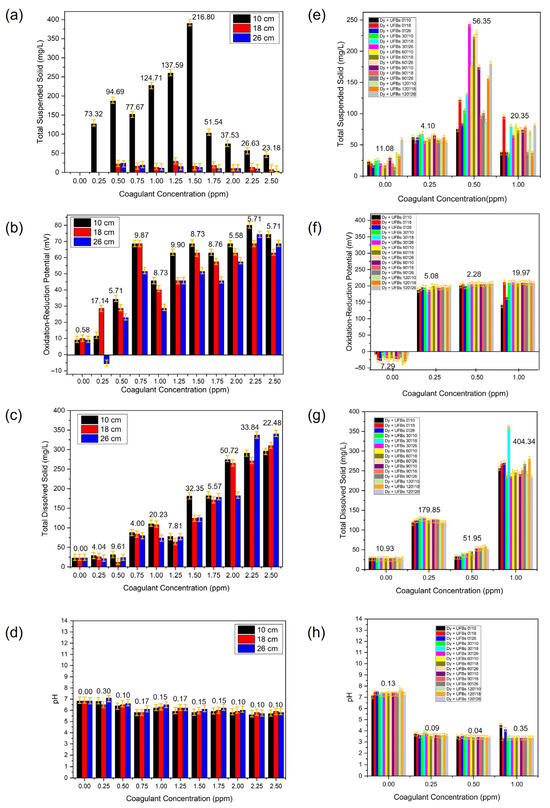 Figure 13 shows the TSS, TDS, ORP, and pH during coagulant optimization without (a–d) and with UFBs (e–h). TSS is usually the most representative physicochemical parameter for calculating the optimal coagulant dosage. The TSS represents the interaction of the coagulant with the colloidal particles or suspended material, such as dyes that affect the degree of transparency of the water due to the coagulation of suspended particles. As previously observed in Figure 11, the optimal coagulant dose resulted in an optimal pH range because if the water had a high degree of alkalinity, the reaction of the coagulant was affected [45].