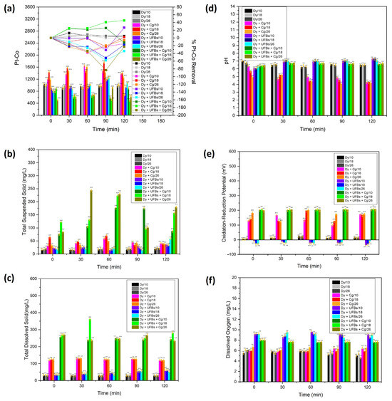 Figure 14a shows the Pt-Co scale (left y-axis) and the efficiency of removing dye waste (right y-axis) as time elapsed from 0 to 120 min. The initial value of Pt-Co at all levels (10, 18, and 26 cm) was relatively similar at 1000. Figure 14a and Table 4 show that treatment using only coagulant resulted in the Pt-Co scale rising above 1000 at all bubbling times (0, 30, 60, 90, and 120 min) and heights (10, 18, and 26 cm). The increase in Pt-Co in the chamber was due to adding a coagulant. In the treatment using only UFBs without coagulant, the effect of the UFBs bubbling treatment at 120 min was visible, while, at heights of 10 and 18 cm, the Pt-Co scale decreased. This showed that there was a degradation process of the thiocyanate compound at this level, while, at the height of 26 cm, there was a process of agglomeration of the thiocyanate compound, indicating the effectiveness of flotation, and, as a result, the Pt-Co scale increased. The results of the Pt-Co measurements for various treatment variations (dye + UFBs + coagulant) showed the highest decrease in the Pt-Co scale at 120 min and a height of 18 cm compared to other levels due to the degradation of the thiocyanate compound, with a removal efficiency of 45%. However, a lower degradation process was obtained because, at the level of 10 cm, the residence time was insufficient compared to that at 18 cm. In contrast, at 26 cm, the thiocyanate compound and the coagulant were agglomerated and floated by UFBs’ movement to the surface. Therefore, the Pt-Co increased significantly due to the rebounding of the degraded thiocyanate compound on the surface [40].