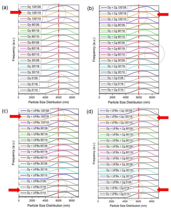 Size distribution: (a) dye, (b) dye + coagulant, (c) dye + UFBs, and (d) dye + UFBs + coagulant.