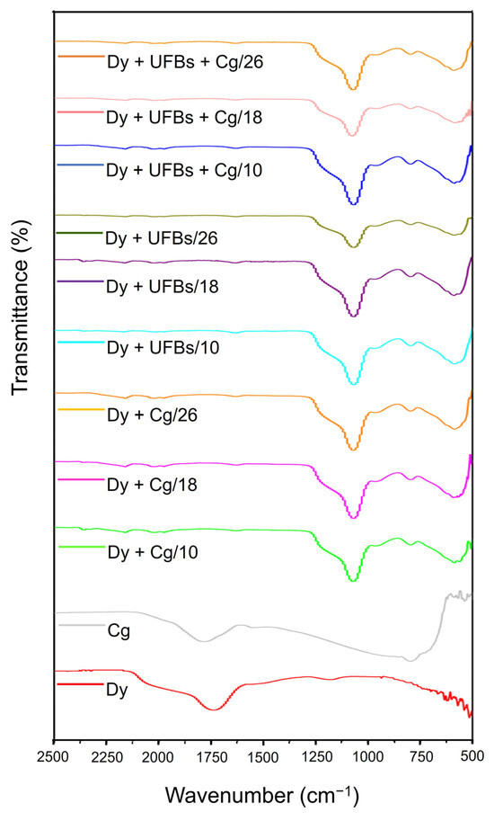The FTIR at various treatments in comparison to coagulants and dyes.