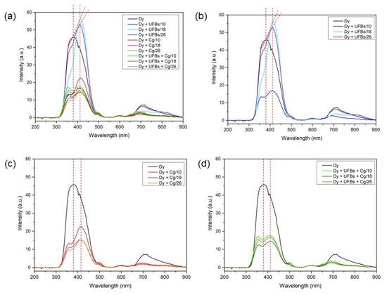 Photo Luminesce (PL): (a) all samples, (b) dye + UFBs, (c) dye + coagulant, and (d) dye + UFBs + coagulant.