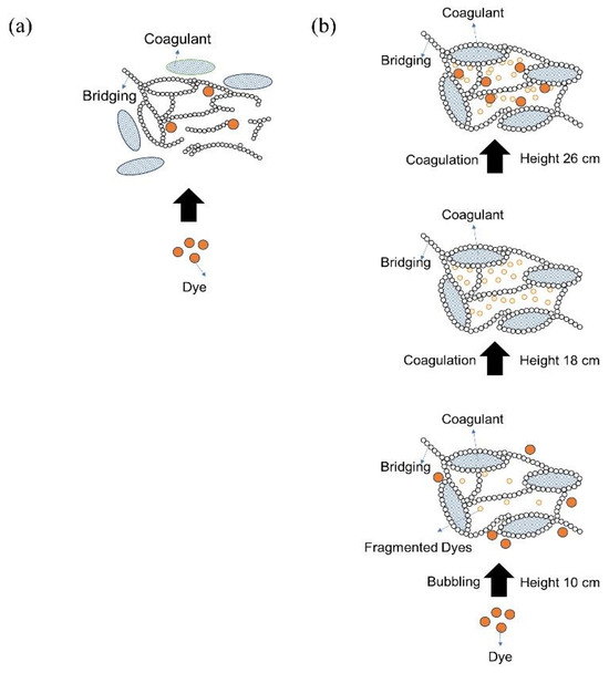 The mechanism of the dye–coagulant–UFBs interaction: (a) interaction of dye + coagulant and (b) interaction of dye + coagulant + UFBs.