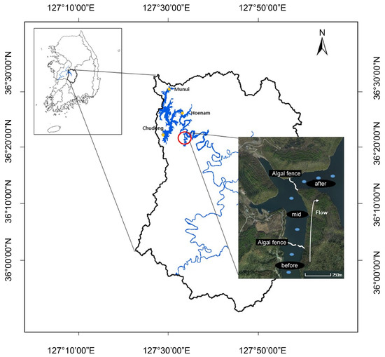 The two study sites were Daecheong Dam (Daejeon, South Korea; 36°22′20 S, 127°33′44 E) in Geumgang River Basin and Bohyunsan Dam (Gyeongsangbuk-do, South Korea; 36°07′34 S, 128°56′56 E) in Nakdong River Basin, South Korea. Two algal fences were installed at Daecheong Dam, and the specific location of the installation is shown in Figure 1. The algal fence used in this study was made of polyester and had a depth of 7 m. The field data was collected between March 2019 and October 2021, with variations in the number of survey items and the survey timing specific to each site. The data quantity per item and the survey schedule are provided in Table 3.