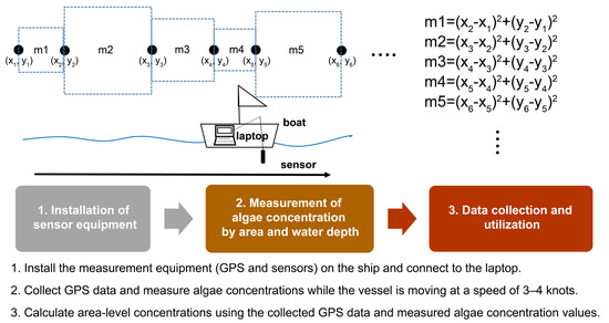 The global positioning system (GPS) coordinates of the measurement points were used to calculate the distance. If the concentration in the area corresponding to the distance traveled was identical, the reference value was established using the average value of the two measured surface points (Figure 2). From the baseline values, we calculated the proportion of algae distribution by depth using the depth-specific measurements taken in the field. Subsequently, we used these values to estimate the quantity of algae in 1-m intervals. The total amount of algae (mg) was determined by calculating the concentration of algae per 1 m3 and multiplying the sum of the measured areas (m1 + m2 + m3 + …) by the water depth, considering the different distances traveled by GPS. Subsequently, the final value was calculated (mg/m3) by dividing the algal concentration by the volume.